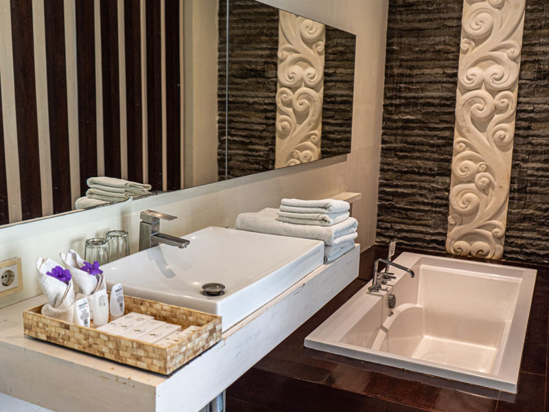 Traditional and contemporary modern-themed furnishings and décor create a light and airy feel, blurring the distinction between indoors and outdoors. Guests can enjoy the soothing sound of the waterfall from the comfort of their bed, catch up on their reading or relax on a chaise longue on the living area or sundeck.